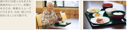 豊かな暮らしを彩るこだわりのお食事。和食、中華、イタリアンのレストランでそれぞれ経験を積んだシェフたちによる、できたての温かいお料理が並びます。管理栄養士が栄養バランスを管理する安心のメニューです。