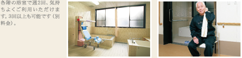 安全・快適に入浴していただけるよう、お身体の状態に合わせたお手伝いをいたします。清潔な個浴が基本ですが、お身体が不自由な方のためにリフト浴や特別浴もご用意。洗い場、脱衣所には床暖房も完備されています。