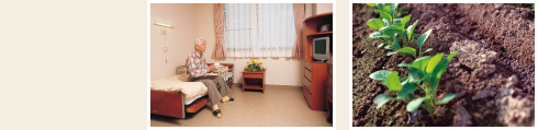 住み心地を追求した、ゆったりと広いお部屋。温水器付き洗面化粧台や独自開発した両開きのトイレドアなど、安全性・快適性を高める工夫を施しております。お一人に一区画マイガーデンもご用意しています。